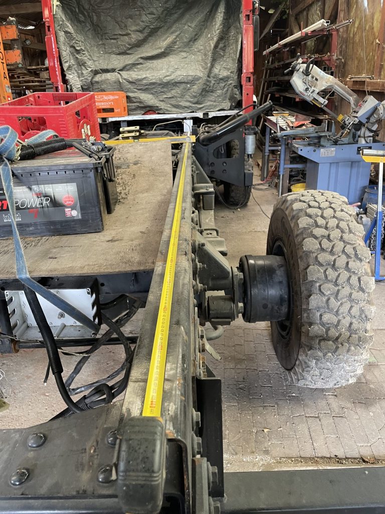 Der Rahmen hat eine Restlänge von circa 4,50 Metern, gemessen Ende Fahrerhaus ohne die Aufnahme für das Fahrerhaus. Mein Plan ist es, darauf eine Kabine mit einer Länge von etwa 4,40 Metern zu bauen. Das passt sehr gut und lässt hinten nur einen kleinen Überhang, was dem Gesamtkonzept entgegenkommt.