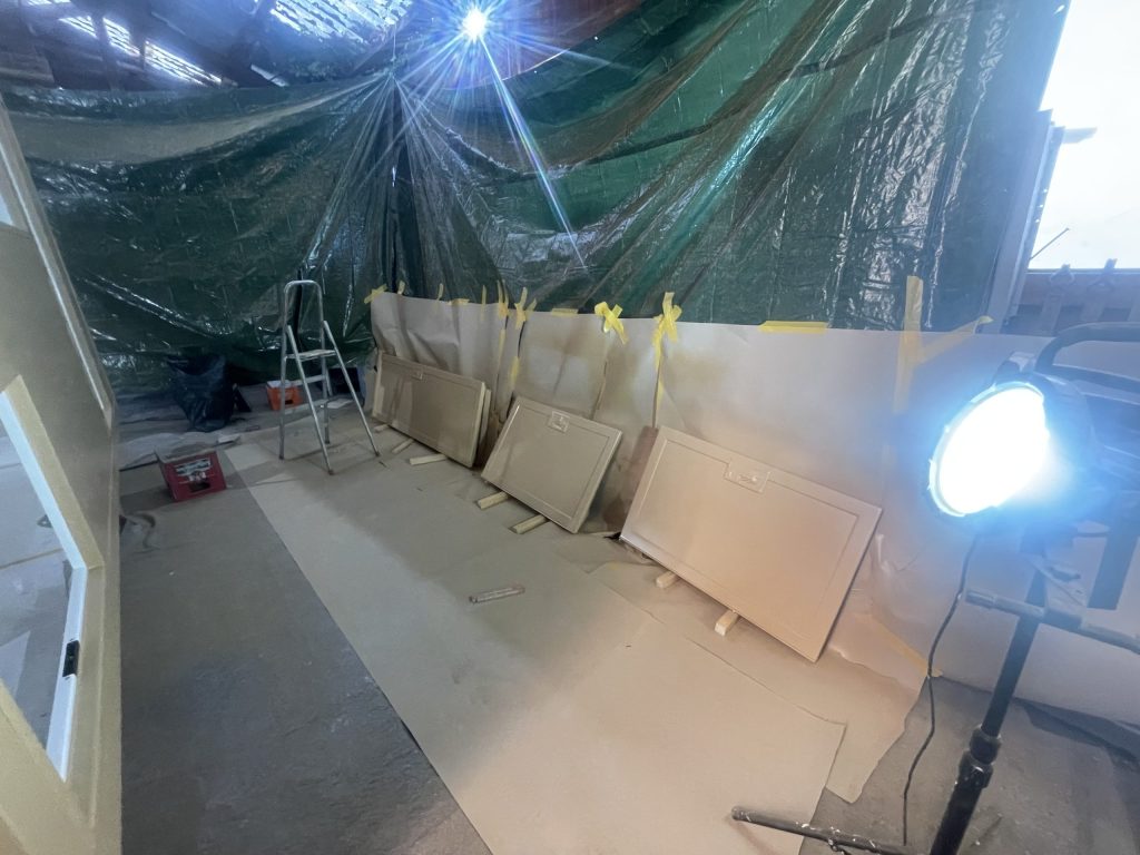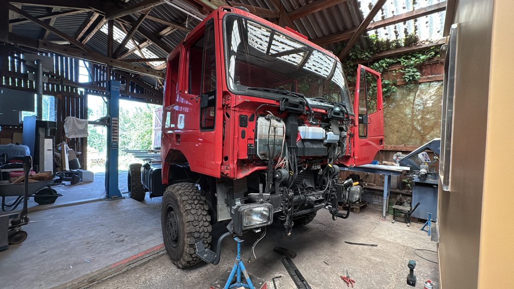 Nach längerer Überlegung, was und in welchem Umfang lackiert werden soll, ging es schließlich an die Lackierung. Zuerst wurde der Koffer, anschließend Teile des Fahrerhauses lackiert. Die Arbeiten fanden unter eher schwierigen Bedingungen in einer Scheune statt.